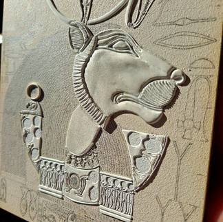 Views of the Akem-Shield of Sekhmet Who Incinerates the Rebels showing how the intricate reliefs appear in direct sunlight. Currently at work on the pectoral elements of the Lions of East and West.
